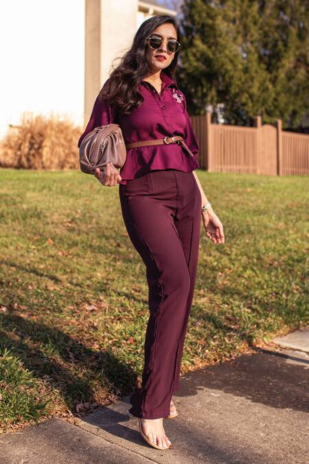 Wine top with 3D floral motif embellished on the side and elbow length puff sleeves. Comes with trousers.