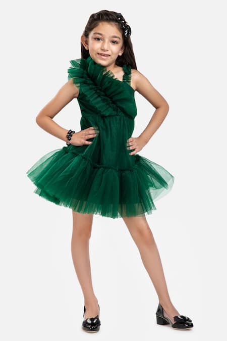 Green dress featuring an asymmetric neckline and ruffle details