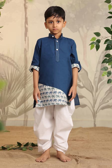 Teal blue kurta featuring a side cut with elephant print white panel and folded printed cuffs on the full sleeves. Paired with white balloon pants for a cohesive look.