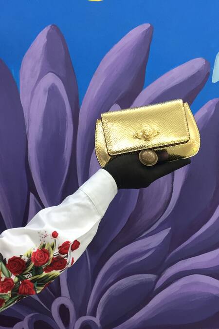 Gold textured leather clutch featuring a curved structured shape and an envelope flap