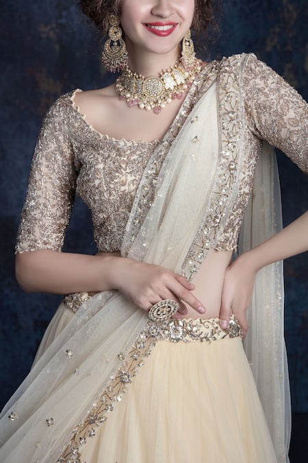 White Tulle Boat Embroidered Bridal Lehenga Set
