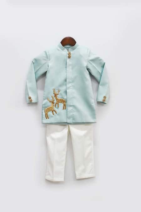 Blue bandhgala featuring deer patch embroidery and a band collar. Paired with cotton pants featuring a semi-elasticated waist.