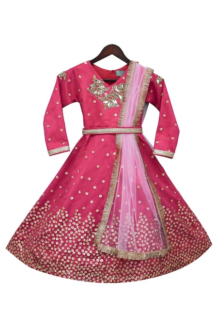 Pink anarkali set featuring sequin embroidery and a netted dupatta. Includes a back zipper and dori embroidery details.