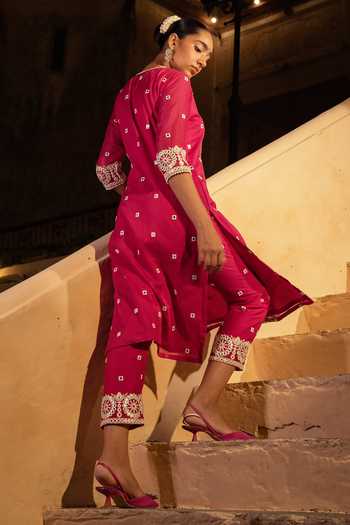 Fuchsia Cotton, Tulle, Net Embroidery Floral Mirrorwork Kurta With Pant