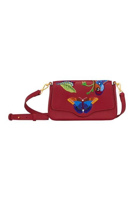 Red crossbody bag featuring hand embroidered butterfly motifs highlighted with crystals, gilded with 24 carat gold. Comes with adjustable shoulder strap.