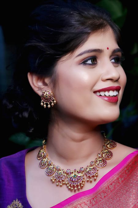 Carved peacock motifs on the necklace, Stone embellishments with bead drops, Stud earrings with push back clasp