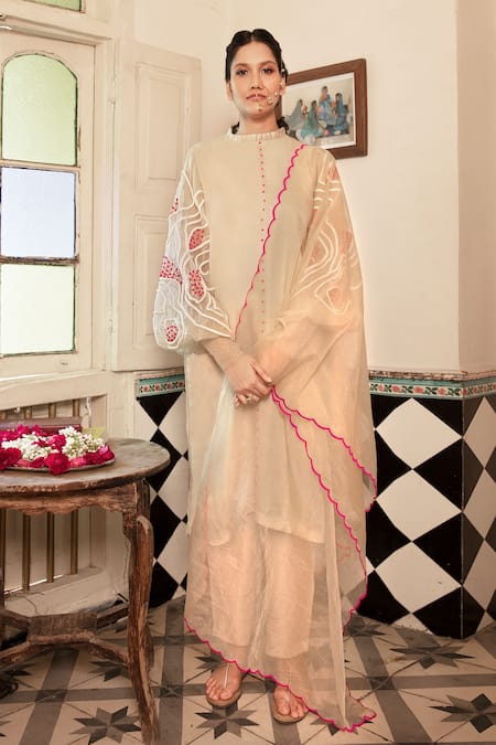 Ivory , Organza Thread Pleated Round Izara Sleeve Embroidered Kurta Set