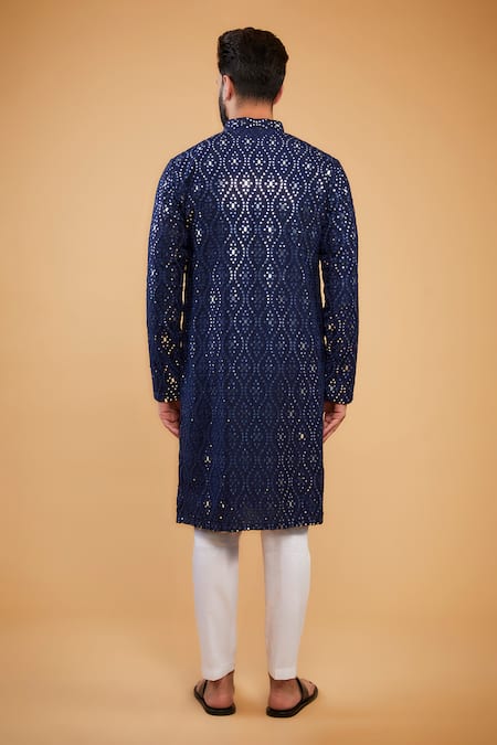Midnight blue silk kurta featuring heavy mirror and thread work embroidery