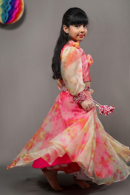 Pink Silk, Organza Fabric Flowers Tie And Dye Lehenga Set