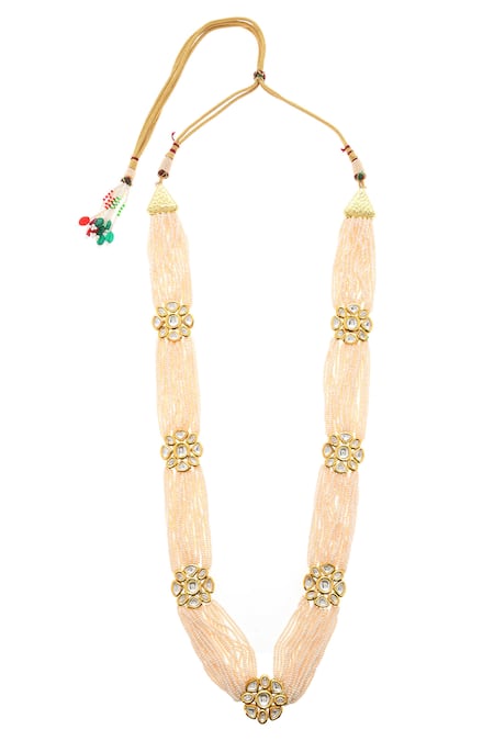 Floral motifs adorned with kundan stones, Multi-string design with pearl embellishments, Tassel drawchord for adjustable fit