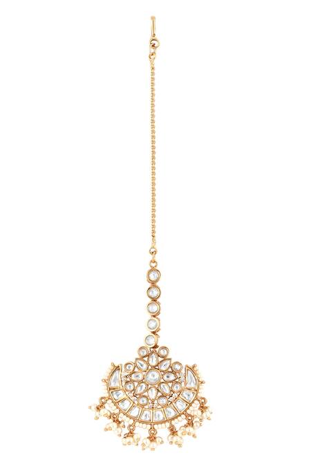 Gold maangtikka featuring a crescent moon motif adorned with kundan stones and a pearl rim