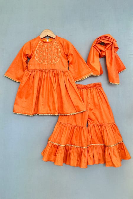 Buy_Label Neeti_Orange Cotton, Linen Zari, Beads Embroidered Peplum Kurta Sharara Set _at_Aza_Fashions