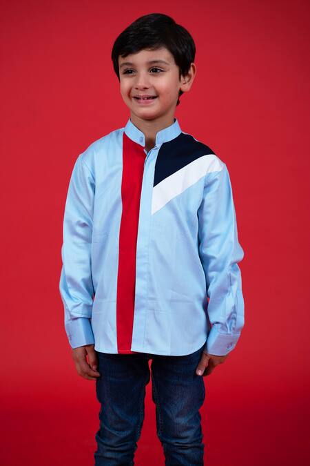 Sky blue cotton shirt featuring navy, red, and white color blocking