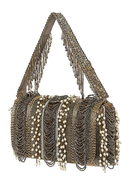 Gold and silver flapover clutch featuring tassel embellishments and hand embroidery with luminous micro beads and baroque pearls