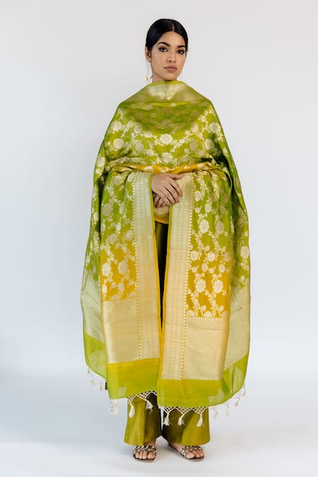 Sap green pure banarasi silk dupatta with floral woven motifs & fringe border.