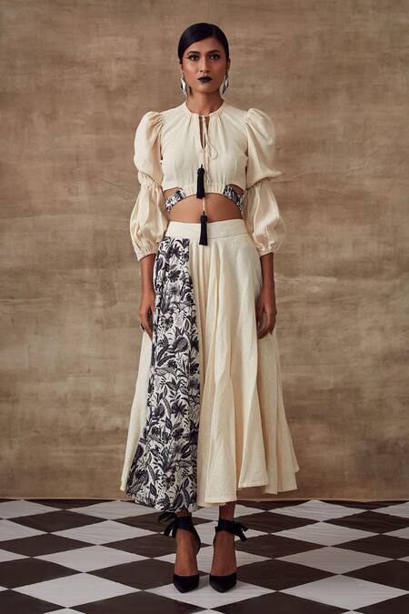 Ivory one-panel circular skirt with floral prints. Paired with balloon sleeve top with an elastic on waist & side cut-outs.
