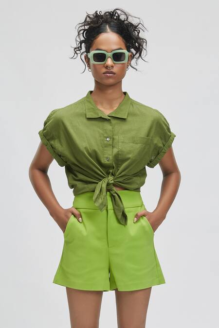 Olive organic handloom cotton button down shirt with front tie-up, pre-rolled up short sleeves, patch pocket & spread collar.