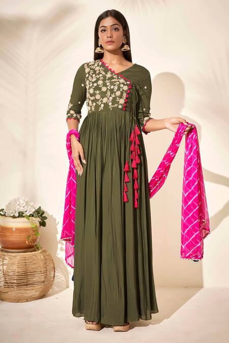 Olive green overlapping angrakha with side tassel tie-up, floral embroidery, pleated detail & cutwork sleeves. Paired with leheriya dupatta.