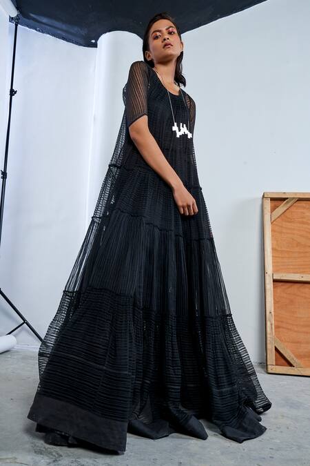 A black Noil Silk maxi dress featuring a round neckline, half sheer sleeves, and a tiered design with an all-over striped pattern.