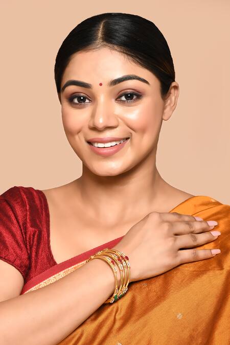 Gold toned set of 4 single lined bangles with multi color stone embellishments.