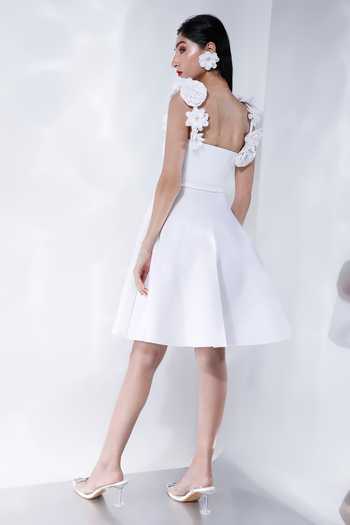 White dress featuring a square neckline and flared hem. Comes with detachable straps adorned with 3D flower hand embroidery.