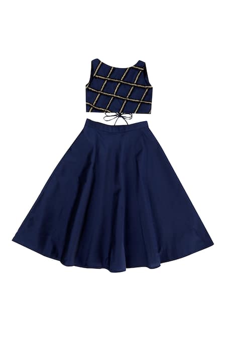 Blue lehenga set featuring a checkered embellished blouse with a round neckline and sleeveless design. The lehenga includes a back criss-cross tassel tie-up for added detail.