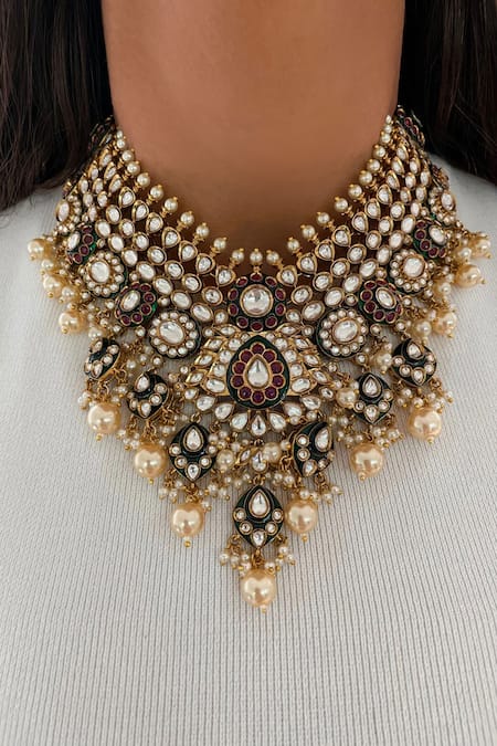 Emerald Green Pearls, Diamonds Kundan Choker Set