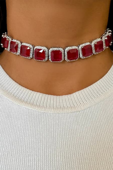 Buy_PRERTO_Red Stones, Diamonds Ruby Embellished Tennis Choker Set _at_Aza_Fashions