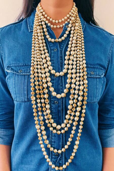 Gold and white long necklace handcrafted with multi-color layered beads embellished chains