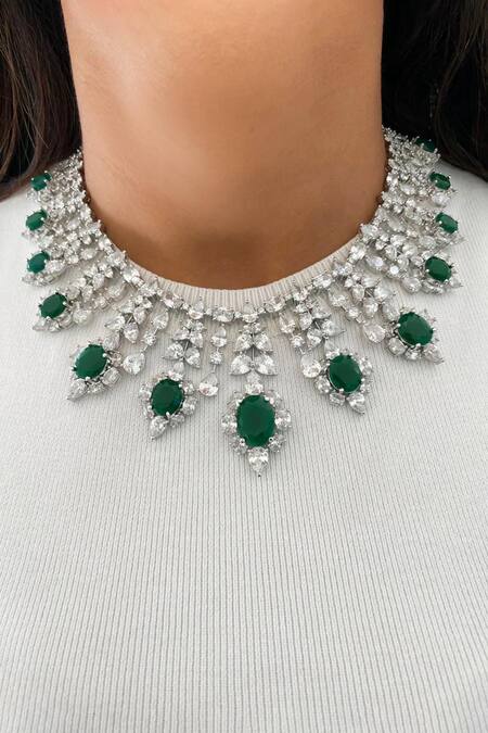 Buy_PRERTO_Silver Plated Diamonds, Stones Emerald Green Diamante Floral Necklace Set_Online_at_Aza_Fashions
