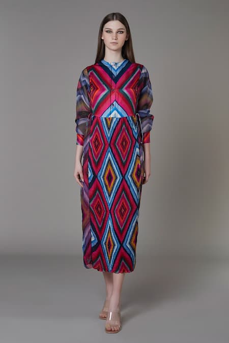 Multicolored tunic style midi dress with diamond print, organza sleeves & side tie-up detailing.