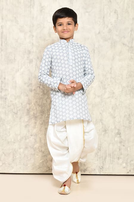Grey kurta featuring chikankari thread work all over. Paired with a white dhoti pant.