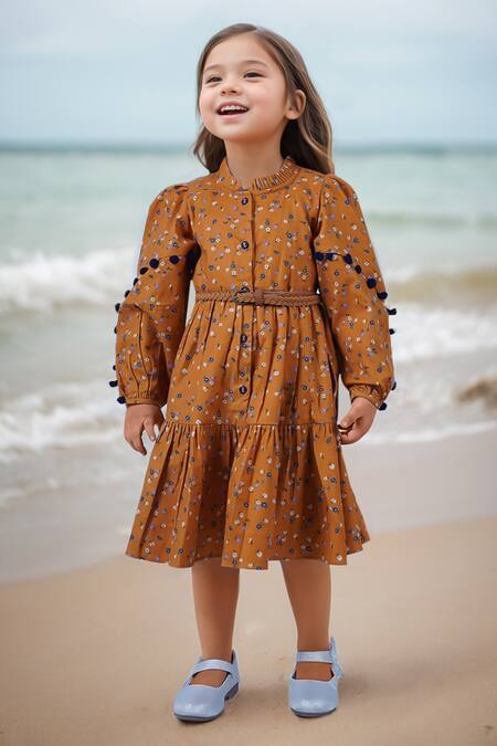 Pom pom detailing on sleeve cuffs, Tiered skirt design, Button-down front closure