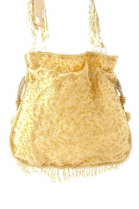 Gold silk potli bag featuring embellished cut dana tassels highlighted with pearls