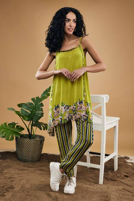Green longline strappy top featuring orchid bloom embellishments and an asymmetric hem. Paired with printed pants in coordinating colors.