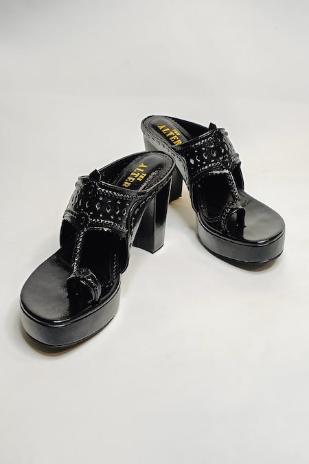 Black kolhapuri block heels featuring a braided and cutwork design with a toe ring