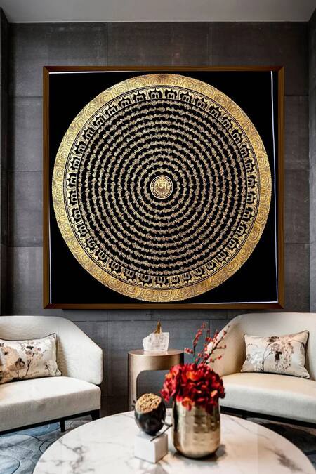 Multicolor square-shaped handmade Om mandala painting on a canvas base.