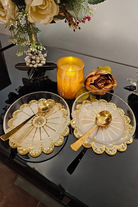 Yellow Acrylic, Polymers And Glass Daisy Carved 2 Pcs Dessert Bowl