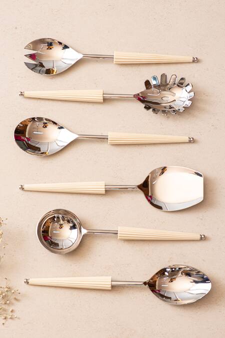 Silver stainless steel set of 6 serving spoons with white ivory umbrella handle.