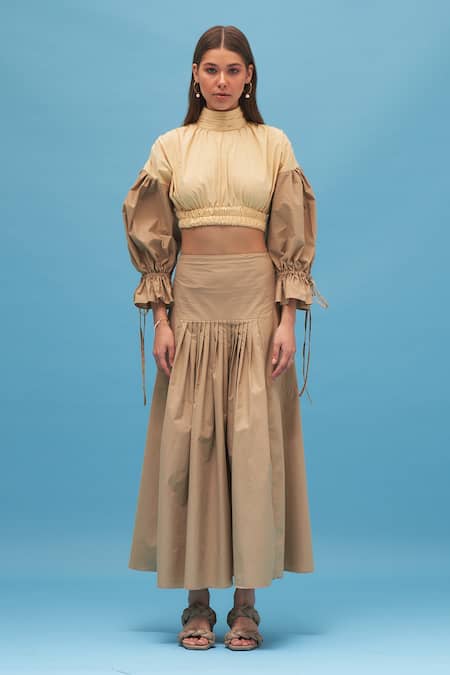 Beige A-line, asymmetrical skirt in cotton base with knife pleat details.