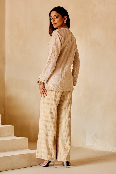 Beige tunic featuring all-over beaded embroidery and mirror work placket