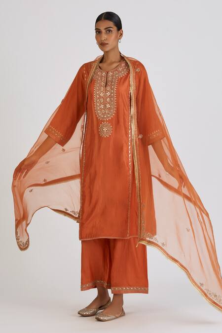 Orange rust dupatta in a sheer organza base with zardozi motifs on the edges and kiran along the borders.