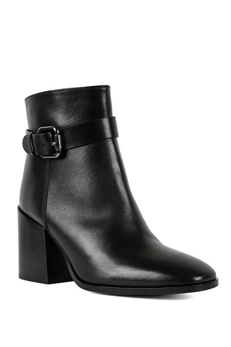 Black ankle boots featuring a pointed toe and a pewter buckle strap