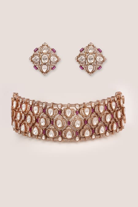 Buy_Zevar By Geeta_Gold Plated Diamonds, Stones Moissanite Choker Set _at_Aza_Fashions