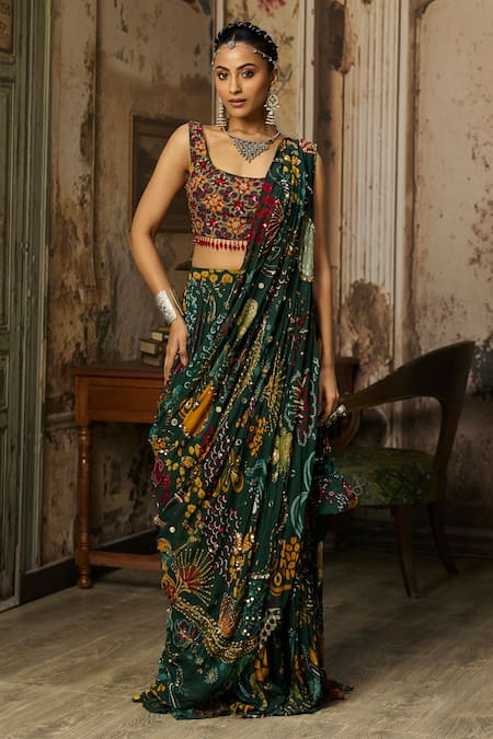 Discover the ultra-winning combination with a contemporary enough variety of sarees to make a sartorial statement. These printed sarees are ideally suited for cocktail parties or day events.
