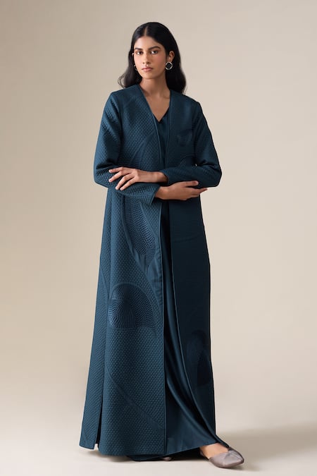 A dark smokey blue abaya kaftan in shantoon fabric featuring intricate quilting and fine resham embroidery with paan leaf motif and parrot patterns. It is paired with an inner slip in ivory cotton silk.