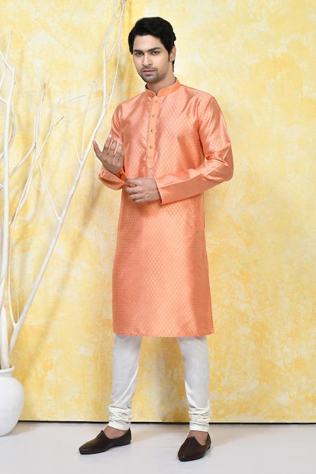 Orange kurta featuring full sleeves and mandarin collar with quad crest motif resham woven detailing. Paired with a white silk churidar.