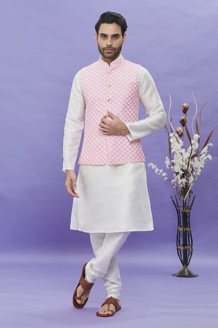 Pink bundi featuring all-over floral thread embroidery with a Mandarin collar