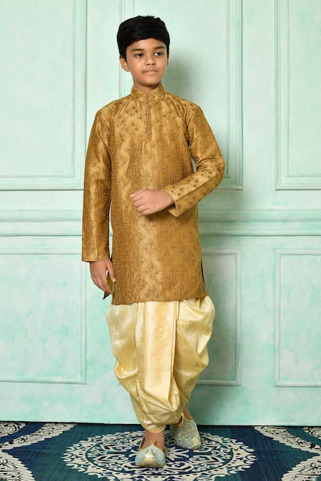 Yellow kurta in dupion art silk featuring floral embroidery and a mandarin collar. Paired with beige dhoti pant with side slits and front potli button detailing.