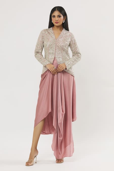 Pink jacket featuring crystal and pearl embroidered feather motifs, paired with a solid satin skirt in a draped pattern. The jacket has a raised neckline and full sleeves with a curved hem.